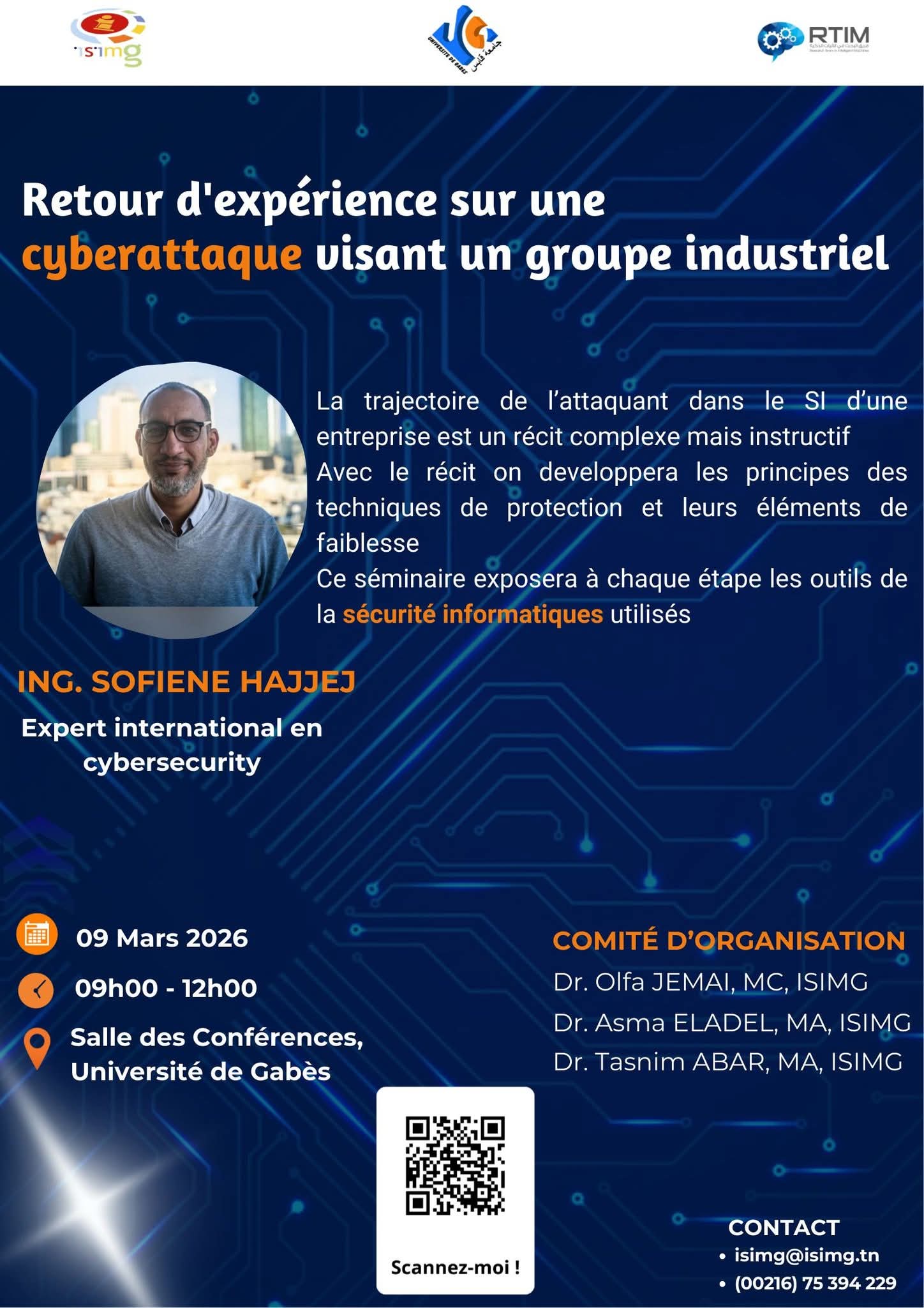 Séminaire Retour d'expérience sur une cyberattaque visant un groupe industriel Organisé par ISIMG & RTIM09 Mar. 2026 09:00-12:00 Salle des conférences de l'université de Gabès Avis des Participants Images de l'évènement