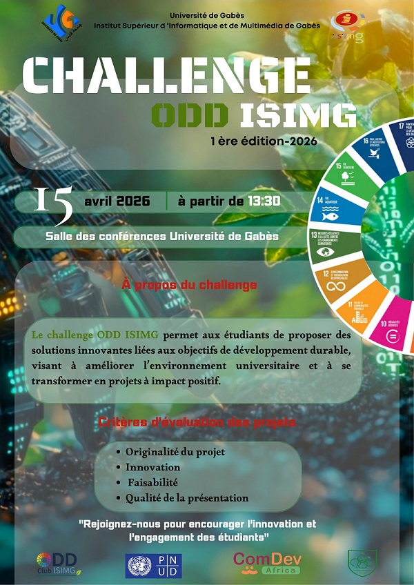 ODD Challenge ISIMG Organisé par ISIM Gabès15 Apr. 2026 13:30 ISIM Gabès Avis des Participants Images de l'évènement