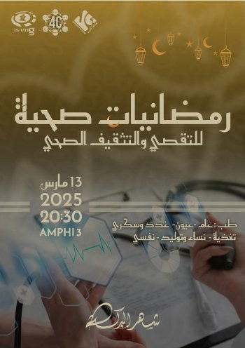 Dans le cadre de la célébration du mois sacré de Ramadan, L'ISIM Gabès organise une soirée spéciale "رمضانيات صحية", qui se tiendra le jeudi 13 mars 2025 à partir de 20h30.